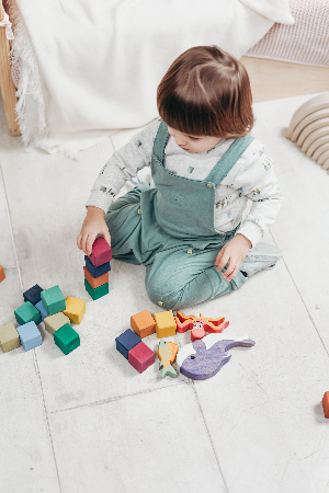 - 5개 이상의 작은 블록이나 장난감을 서로 겹쳐 쌓습니다.